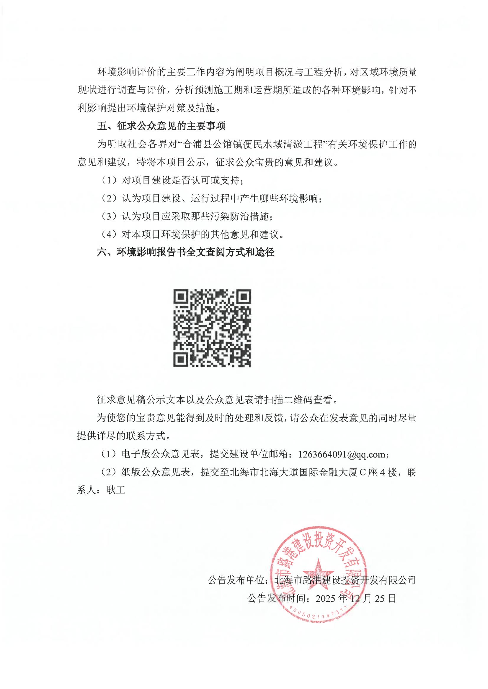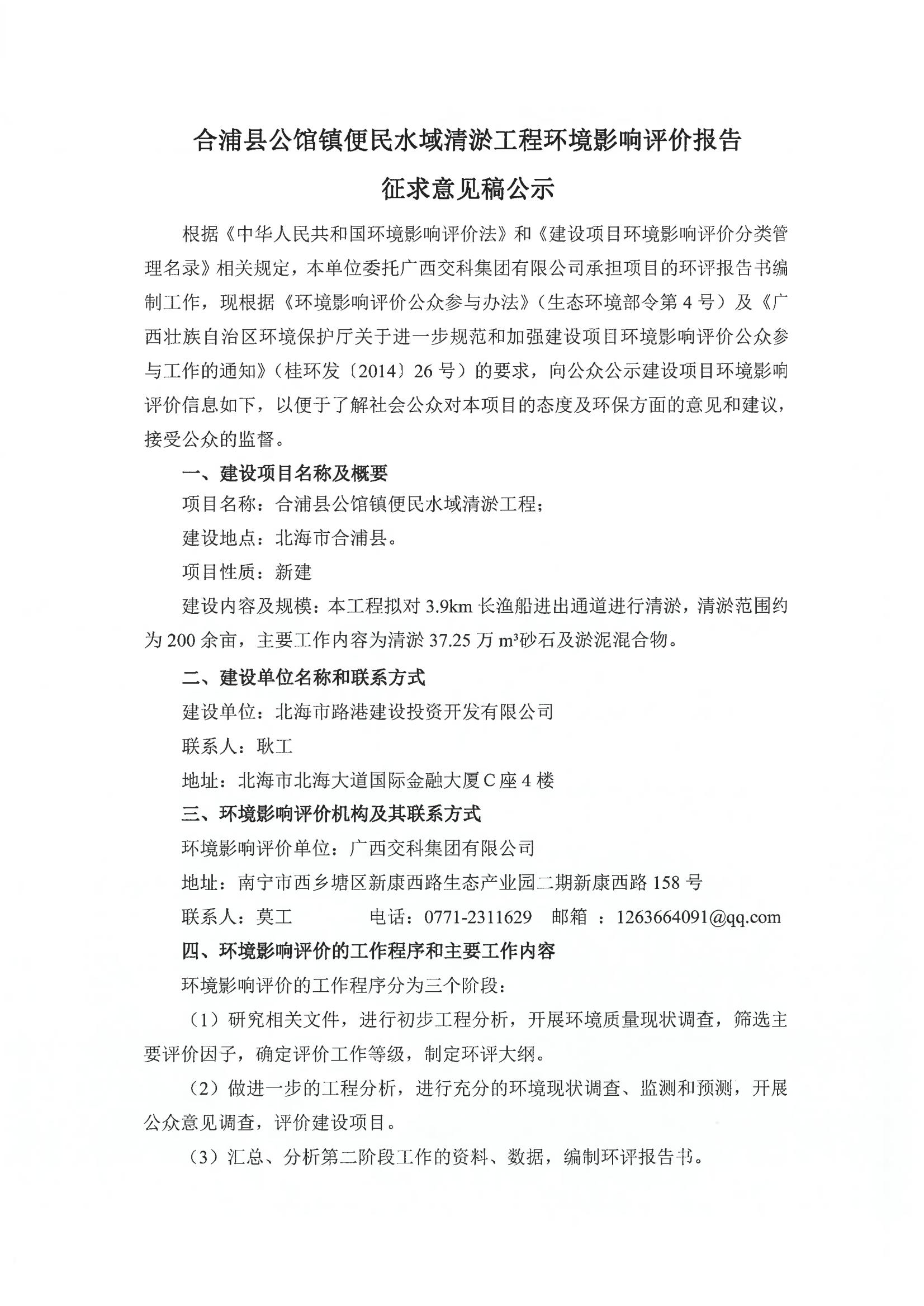 合浦縣公館鎮(zhèn)便民水域清淤工程環(huán)境影響評(píng)價(jià)報(bào)告征求意見(jiàn)稿公示