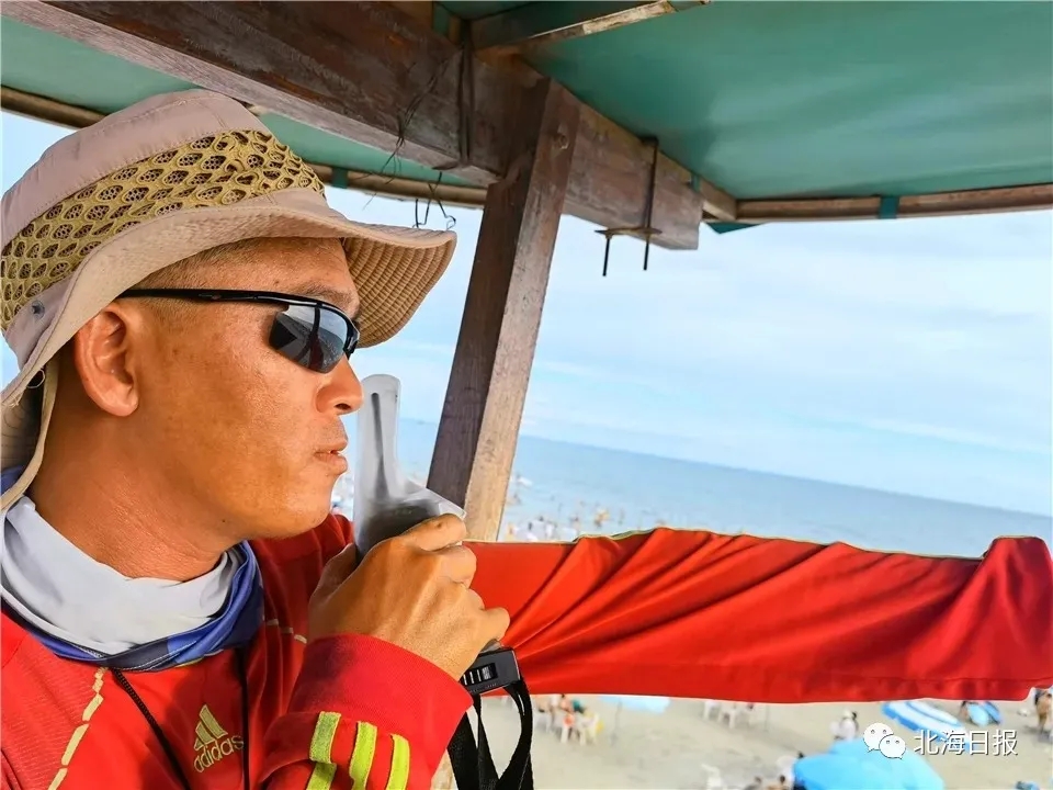 唐瑞鴻告訴我們,北海銀灘救生員每天都在救援站執(zhí)勤,利用瞭望塔在海邊巡視,做到耳聽六路,眼觀八方,以便發(fā)現(xiàn)危險時及時展開救援。他所在的銀灘救生一隊目前有17位專業(yè)救生員,每天分為兩個班組開展工作,其中一組從上午7點半到下午2點半,另一組從下午2點半到晚上9點半,負責的海域約5公里。