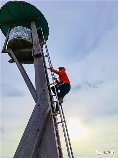 救生員爬上約10米高的瞭望塔。